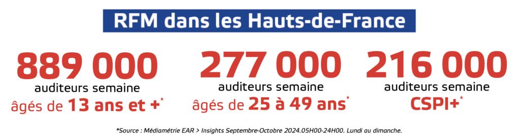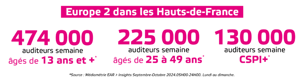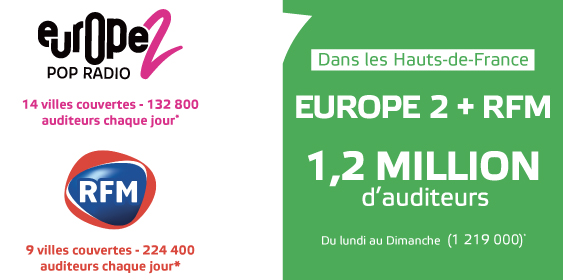 Enfin, pour les annonceurs implantés dans les Hauts-de-France, en partenariat avec Lagardère Publicité News, nous proposons des campagnes nationales sur les antennes d’Europe 2, RFM et Europe 1.